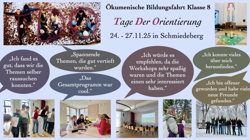 Hier – haben wir mit dem praxiserprobten Programm namens „Tage der Orientierung“ lehrplanrelevante, spannende Themen (u.a. Sucht, Tod, Zukunftsvorstellungen) schülernah, kreativ bewegt und tiefgründig bearbeitet. Das hat nachhaltig berührt.